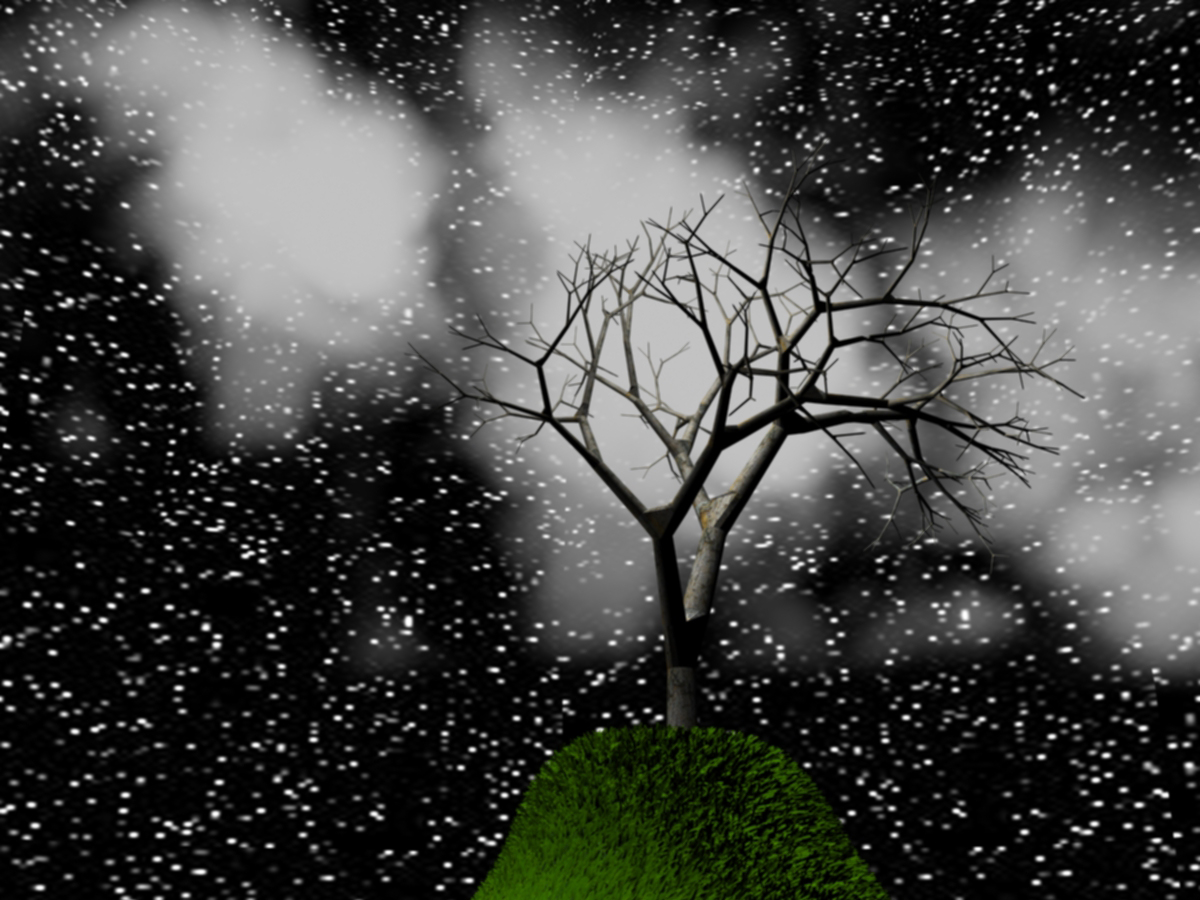 small grass and tall grass towards the back. Back of scene is a mountainous structure with a the pond in the middle reflecting the tree and I expect to add nice peacefull relaxing lighting